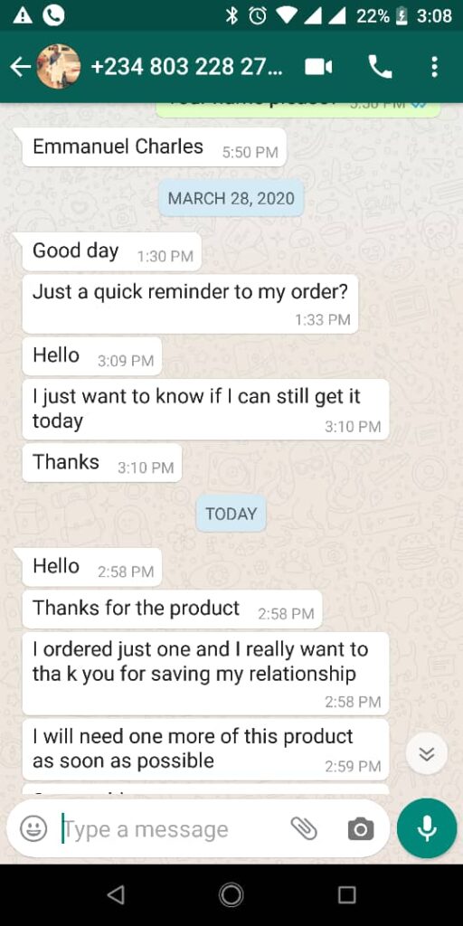 I was at the point of giving up when an old friend of mine from way back in the secondary school, Mr Sampson (I will never forget him in this life) he recommended this relationship-saving product called